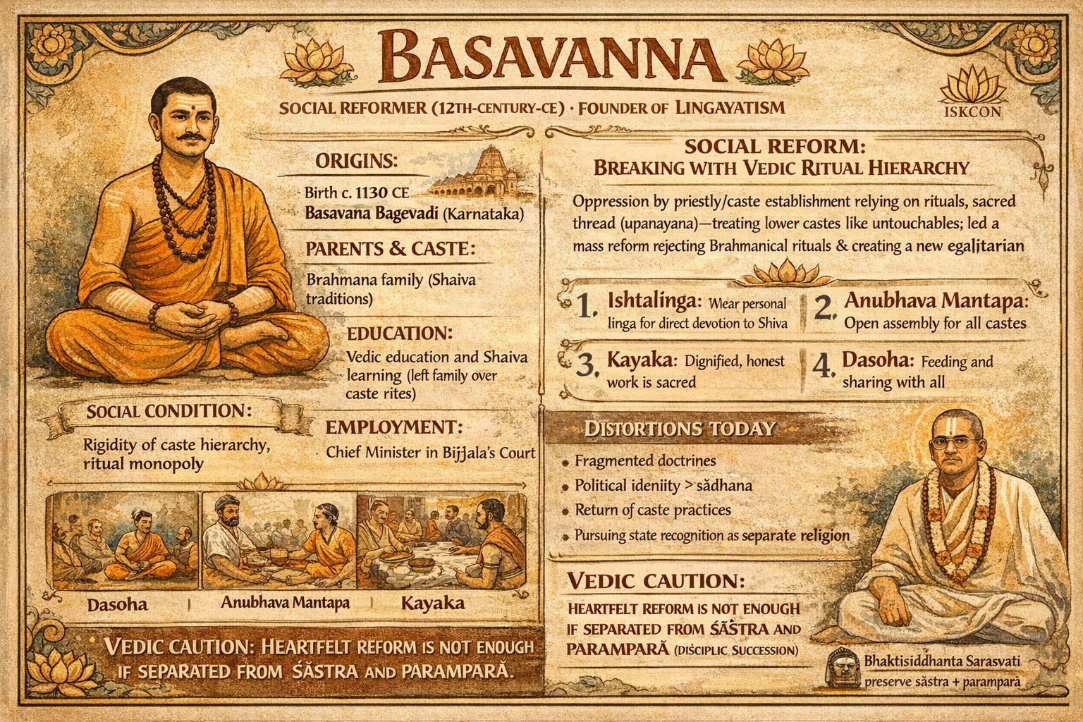 Basavanna’s movement was born from legitimate social and spiritual discontent in a stratified era, and his teachings on equality and devotion have enduring value. But creating a wholly separate system outside paramparic Vedic authority — even for noble motives — risks doctrinal drift over time. The Vedic tradition’s insistence on disciplic succession and scriptural grounding remains the most reliable way to preserve both spiritual depth and social reform in balance.