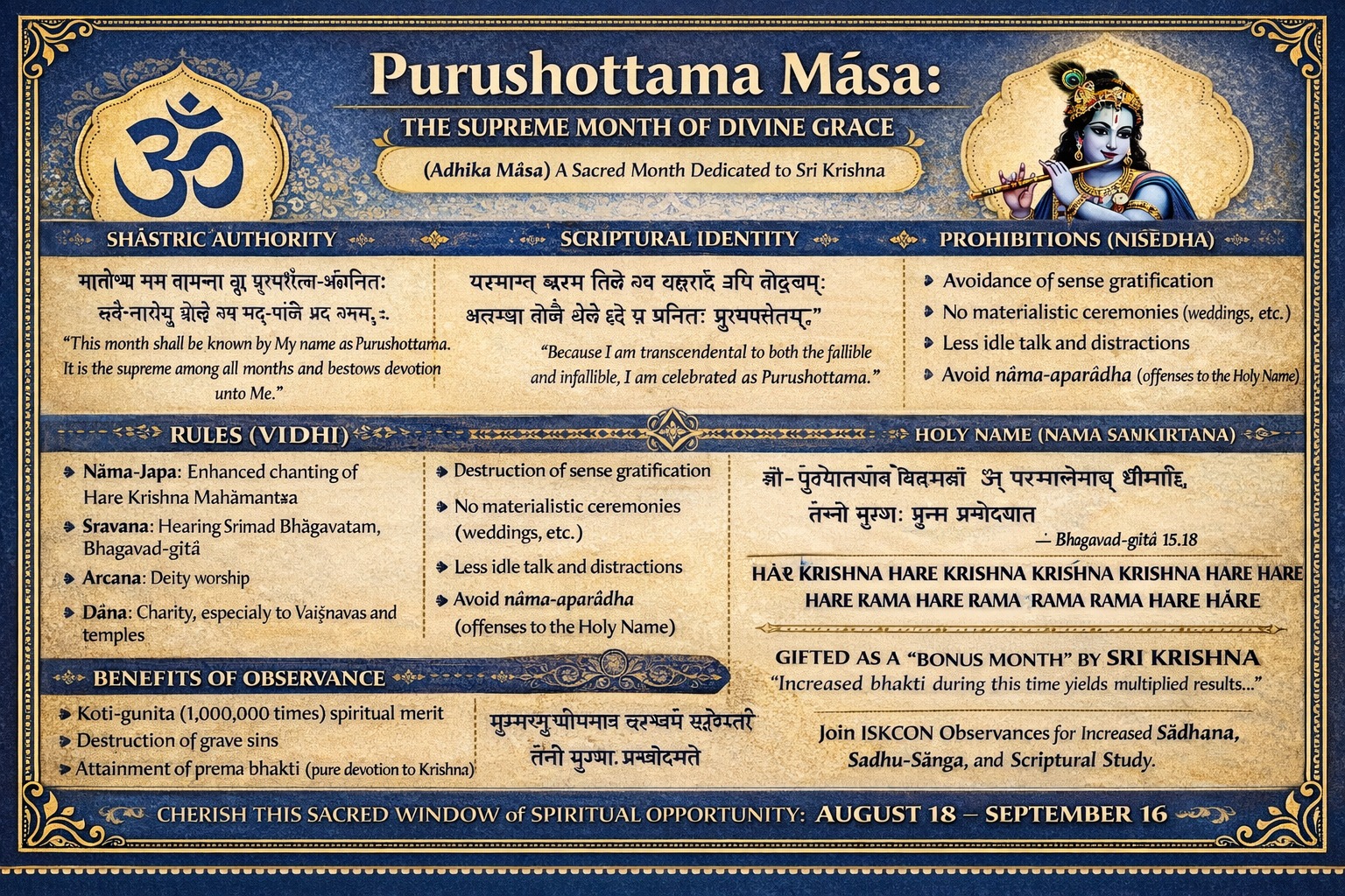 Within the sophisticated calendrical system of Vedic timekeeping, there appears periodically an extraordinary spiritual opportunity known as *Purushottama Māsa, also called **Adhika Māsa. Unlike ordinary months, this sacred period is directly dedicated to the Supreme Personality of Godhead, Śrī Krishna, who is glorified as *Purushottama—the Supreme Person beyond both kṣara (perishable) and akṣara (imperishable).